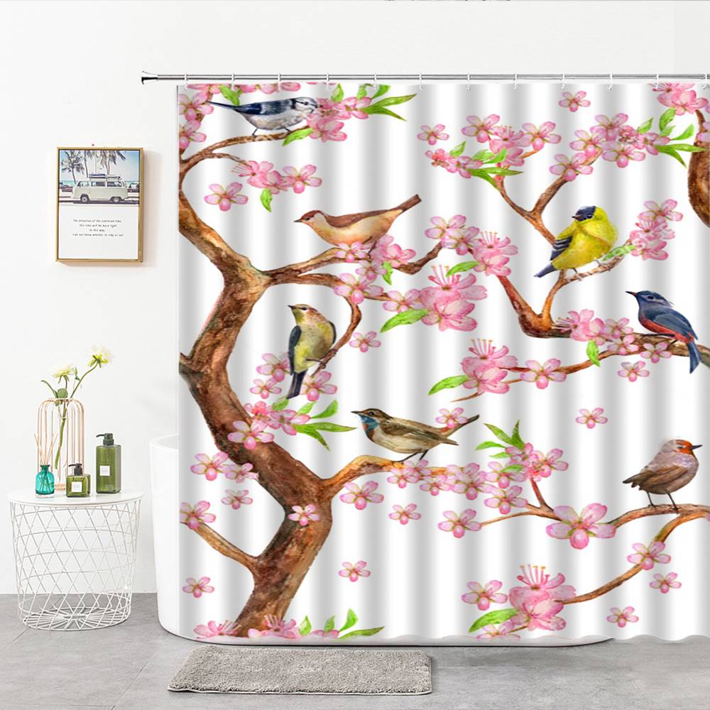 This spring flowers magpie shower curtain will instantly transform your bathroom with its exquisitely designed print - high-quality “magpie” artwork - The magpies resting on a plum blossom branch.