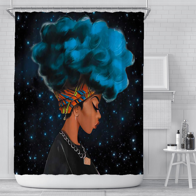 African American woman with blue afro -- Our blue afro bathroom curtain will make a statement in any bathroom.