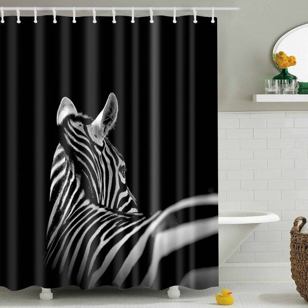 This animal zebra shower curtain will instantly transform your bathroom with its exquisitely designed print - breathtaking, high-quality “zebra” artwork - Black Backdrop Zebra Back View.