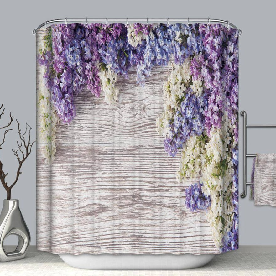This purple flowers lavender shower curtain will instantly transform your bathroom with its exquisitely designed print - breathtaking, high-quality “lavender” artwork - Lavenders on white wood.